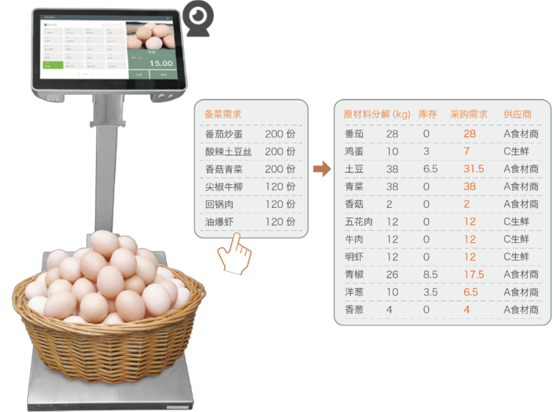 排菜后,采购管理平台会进行原材料分解,结合库存和学生消费大数据,自动生成净菜采购清单。